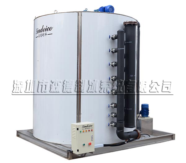 低溫的冷凝液態制冷劑通過蒸發器,與流經蒸發器內壁的水進行熱交換,氣化吸熱,把水降至0℃以下,迅速結成冰,轉動的減速機帶動冰刀把冰片刮落。蒸發器的質量,直接影響片冰機產冰效果和片冰質量。